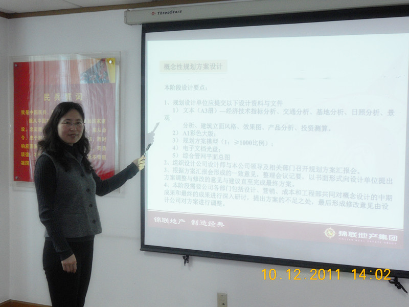 2011年12月10日下午,锦联地产集团人力资源本部邀请地产集团规划设计副总裁孙芳为管理总部全体员工做了题为《规划设计各阶段工作内容》主题内训。 本次培训围绕规划设计六大设计阶段工作内容和各阶段设计要点展开,通过孙总深入浅出的讲解,大家不仅对规划设计流程与内容有了清晰的认识,同时也了解到规划设计工作是如何与相关业务部门进行衔接并贯穿于整个房地产开发过程中。 通过此次培训,加深了大家对房地产规划设计专业知识的了解,对部门间顺畅的业务协作与沟通起了积极的促进作用。今后,人力资源本部将继续邀请各部门高管进行专业知识类培训,为打造锦联地产高素质、高效能的卓越团队而努力。
