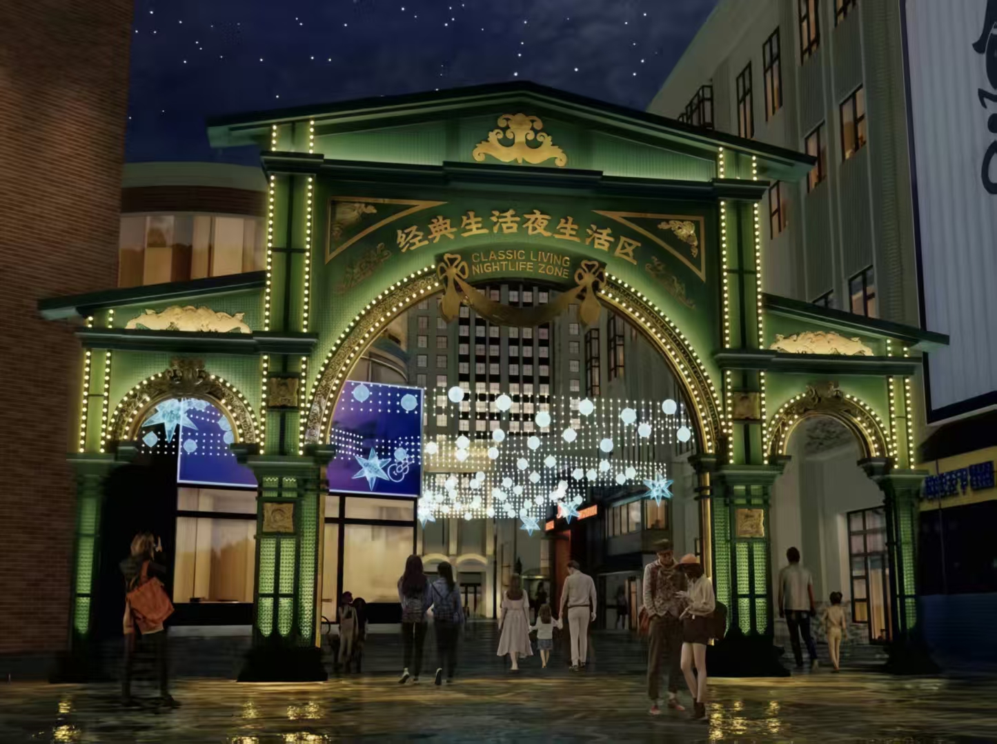 空中引流灯带增设:沿步行街巷上空将铺设总长超百米的动态空中引流灯带,以柔和的暖白光勾勒街区轮廓,不仅提升夜间行走安全性,更通过明暗变化引导人流自然串联各业态区域,增强消费体验的连续性与趣味性。